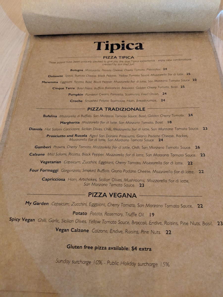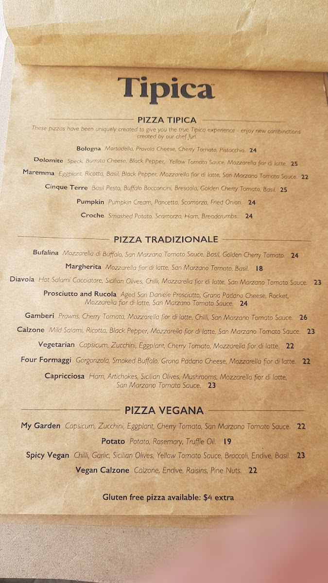 Wrapping up my menu deep-dive at Tipica Pizza Bondi Beach (78 Hall St, Bondi Beach NSW 2026), the selection feels like a confident, crowd-pleasing tour of Italian comfort-well balanced between shareable starters, fresh salads, hearty pasta, and pizzas that clearly anchor the experience. For a classic start, the Antipasti & Salads lineup-Tagliere Toscano, Prosciutto e Bufalo Mozzarella, Cerignola Large Green OlivesCarciofi Grigliati, and Mixed Olive Bowl-sets a convivial tone, while the Insalate choices (Insalata di Rucola e Pera, Panzanella, Caprese Salad) bring brightness and variety for anyone craving something lighter. The pasta section leans into satisfying flavours, from seafood-forward Spaghetti alle Vongole and Fusilli & Gamberi to bold, saucy options like Gnocchi Arrabbiata Sauce and the richer ragù-driven plates-Pappardelle al Ragú di Cinghiale and “His Majesty the Ragù”-that read like must-orders for comfort seekers. Families are well covered too, with a thoughtful KIDS MENU featuring Mickey Mouse Margherita Pizza, Mickey Mouse Margherita with Ham, Kids Tomato Fusilli, and Kids Bolognese beef ragu’ with Gnocchi. Pizza lovers can steer toward the more signature Pizza Tipica creations-Amalfi Pizza, Bologna Pizza, Cinque Terre PizzaCroche Pizza, Dolomite Pizza-or keep it timeless with Pizza Tradizionale staples like Bufalina Pizza, Margherita Pizza, Italiana PizzaNapoletana Pizza, and Diavola Pizza. Finish sweet with dessert classics and Nutella-leaning indulgence: Salame al Cioccolato, Tiramisù di Nonna Tilde, Nutella fried GnocchiNutella Pizza-a finale that feels unapologetically fun.